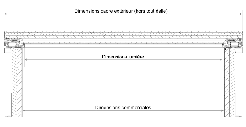 Dimensions commerciales Trémis toiture en cm | Dimensions cadre extérieur (hors tout dalle) l x L en cm | Dimensions lumière Trémie haute l x L en cm | Urc* W/m².K | Poids (Kg) |