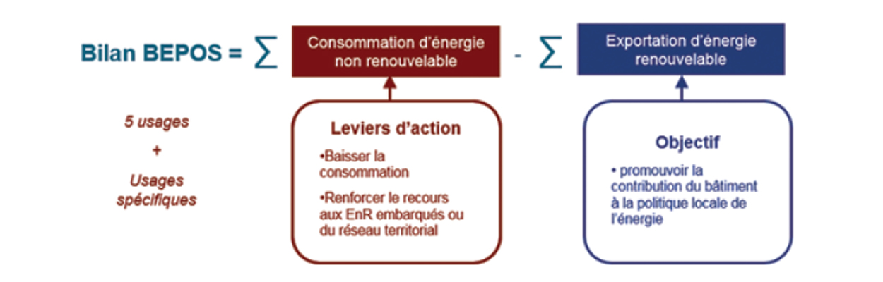 Le bilan BEPOS concerne l’ensemble des usages du bâtiment, en distinguant les énergies renouvelables des énergies non renouvelables (voir l’expression ci-contre).