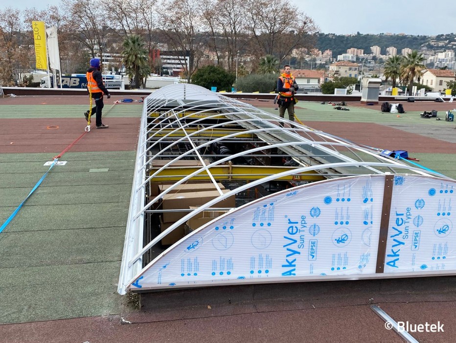 Entrepris fin 2021, des travaux en toiture d’une concession Renault à Nice ont permis le départ d’une rénovation d’anciennes voûtes en polyester. Les appareils sont en partie fixes et d’autres sont équipés d’ouvrants O/F treuil mécanique.