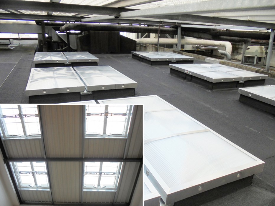 Pour faire un état des lieux et une étude de cas, nous débutons cette forme de compte-rendu par la partie la plus haute de l’atrium. L’ancienne couverture en polycarbonate a été remplacée par un support en bac acier avec étanchéité multicouche. Les appareils de désenfumage à lames ont été remplacés par des lanterneaux DENFC Bluesteel Therm DV Élec XL 180/180 avec remplissage PCA Pearl Inside. Ce choix du maître d’œuvre confère taille optimale d’aération et de désenfumage (Aa = 2,37 m²), amélioration thermique (Urc installée = 2,3 W/m².K) et acoustique (Rw = 28 (-1 ;-4) dB) Il génère aussi un nouveau rendu à l’intérieur des locaux ; le remplissage Pearl Inside intégrant des microbilles de verre apporte tant un résultat phonique qu’esthétique par son effet cristallin à l’intérieur du bâtiment.